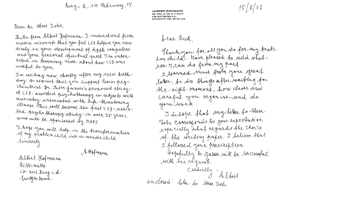 Hello from Albert Hofmann. I understand from media accounts that you feel LSD helped you creatively in your development of Apple computers and your personal spiritual quest. I’m interested in learning more about how LSD was useful to you.